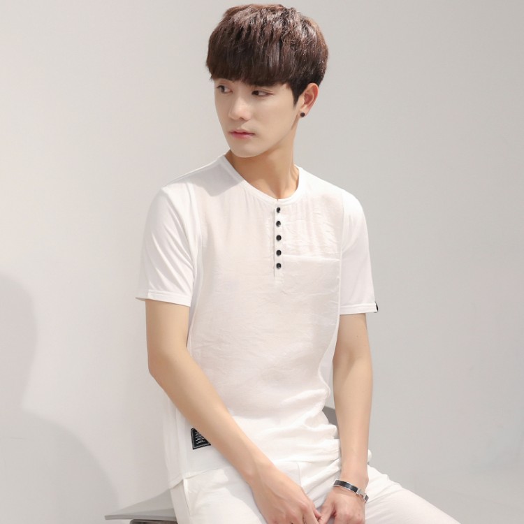 839 T-shirt da uomo in lino con scollo a V in puro colore