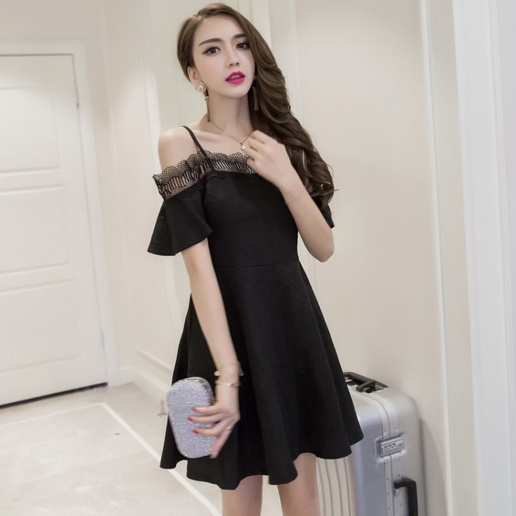 TE7018WMSS Abito in stile coreano con maniche a balza e scollo a barca in pizzo scolpito