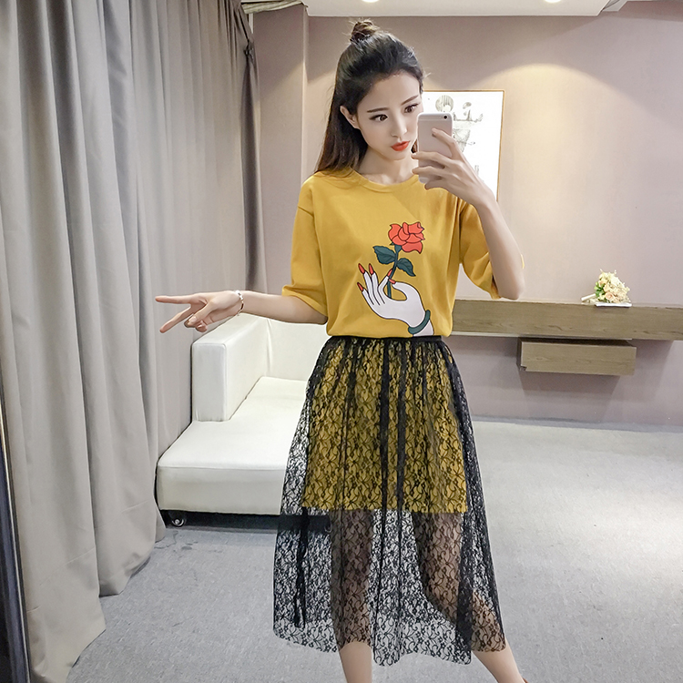 T-shirt a maniche corte con stampa 7173 e gonna in pizzo a vita alta