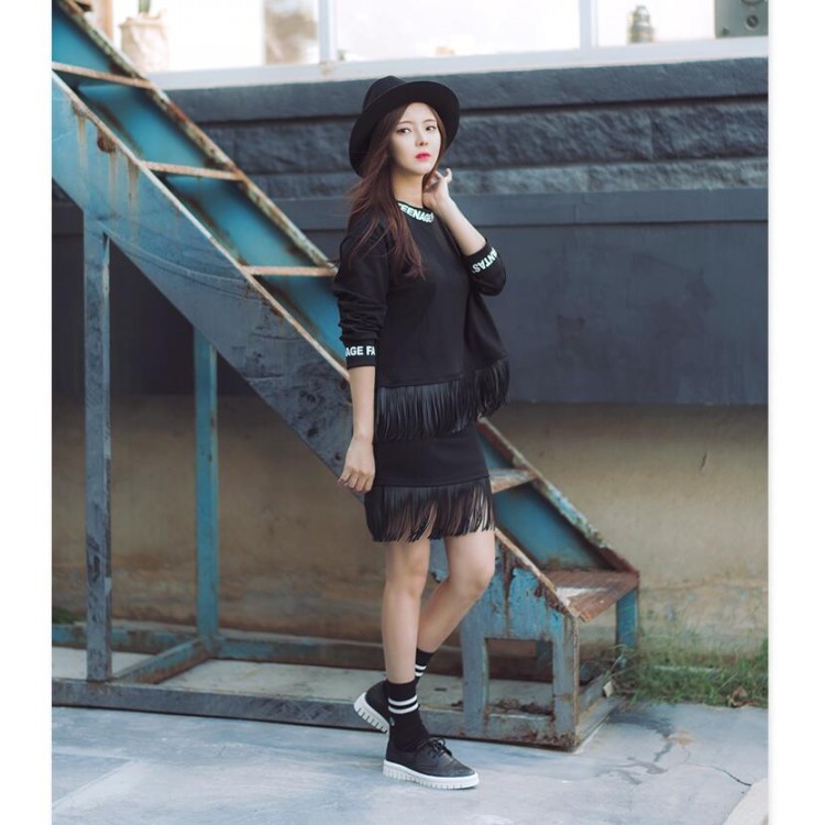 TE6318YZS Felpa con nappe in pu stampa lettere e gonna con nappe
