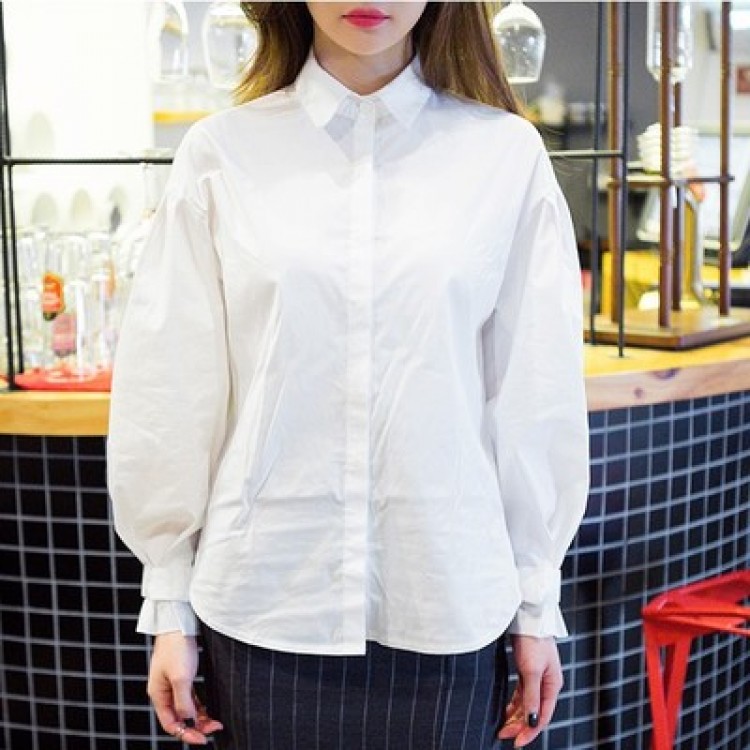 J41348 Camicia slim a maniche lunghe con colletto a bambola e gonna vaporosa bianca