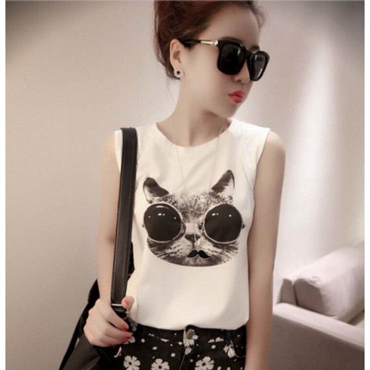 TE6091XPG Gilet senza maniche con stampa gatto e occhiali da sole alla moda