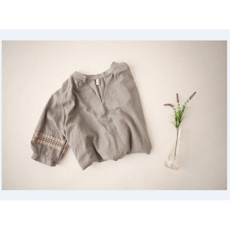 6907 camicia ampia in cotone con ricamo floreale in pizzo a maniche lunghe
