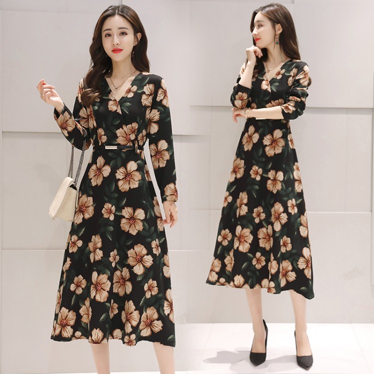 0921 abito lungo temperamento slim a vita alta con scollo a V a maniche lunghe