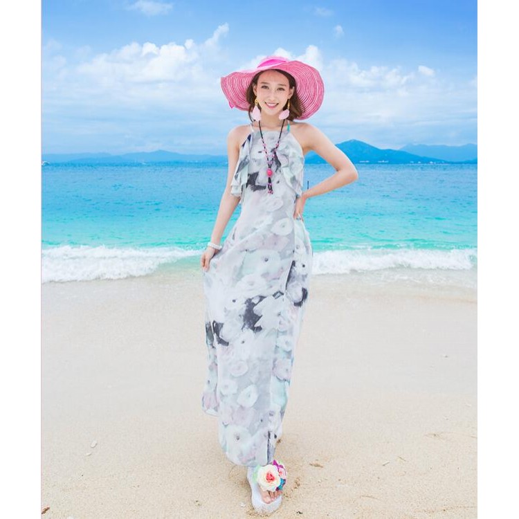 TE9864MSJ Maxi abito da spiaggia slim bohémien senza maniche con balze