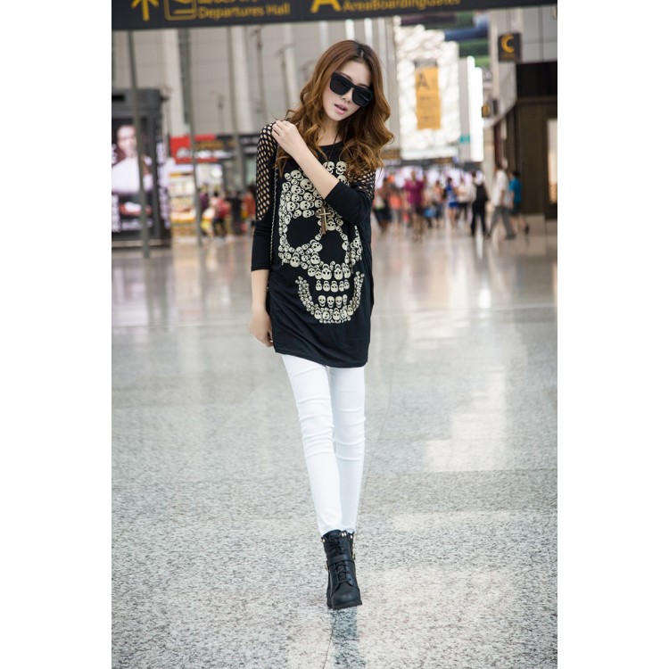 J72949 T-shirt di grandi dimensioni con stampa di teschi in stile coreano con spalle scavate