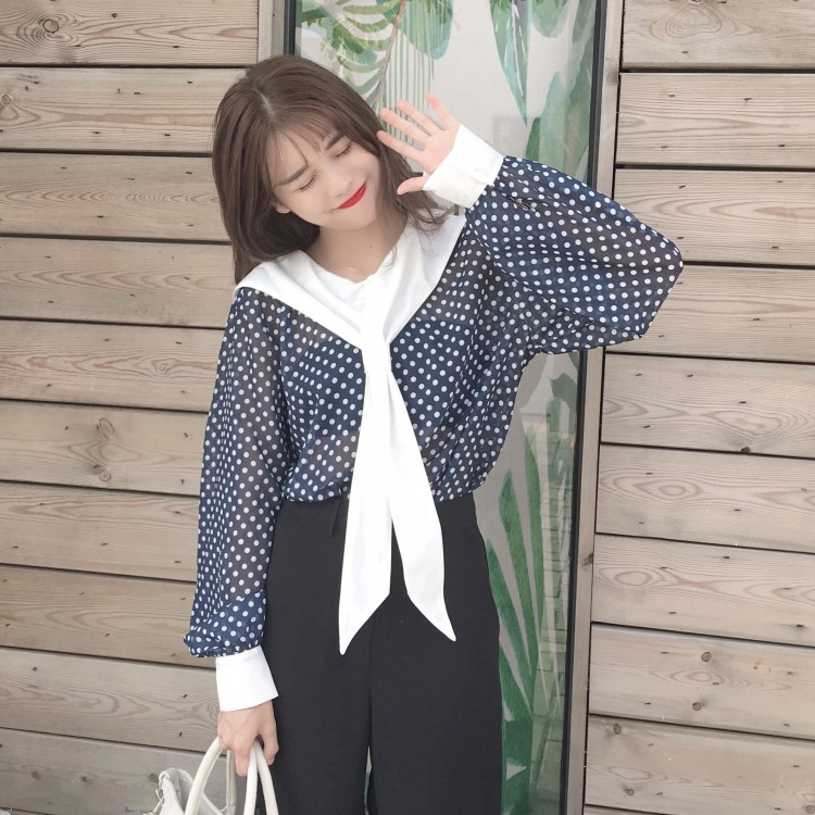 562 La ragazza autunnale coreana sente la camicia con protezione solare dal collo blu scuro