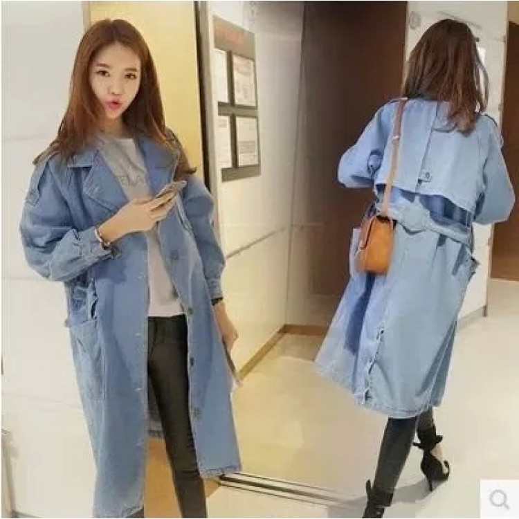 909 Giacca a vento coreana alla moda, giacca di jeans lunga al ginocchio, ampia e larga, con cravatta in vita