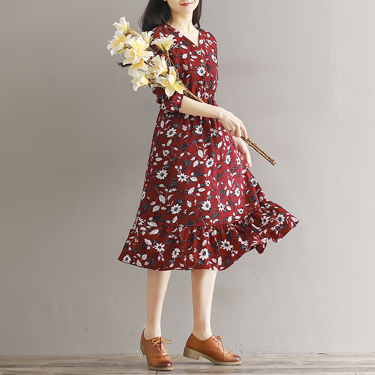 5862 Abito floreale in chiffon con orlo a foglia di loto