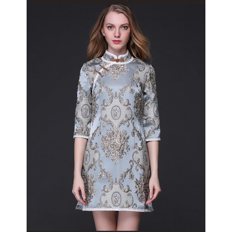 TE9097LLYG Abito cheongsam con spacco e colletto rialzato in tessuto jacquard vintage