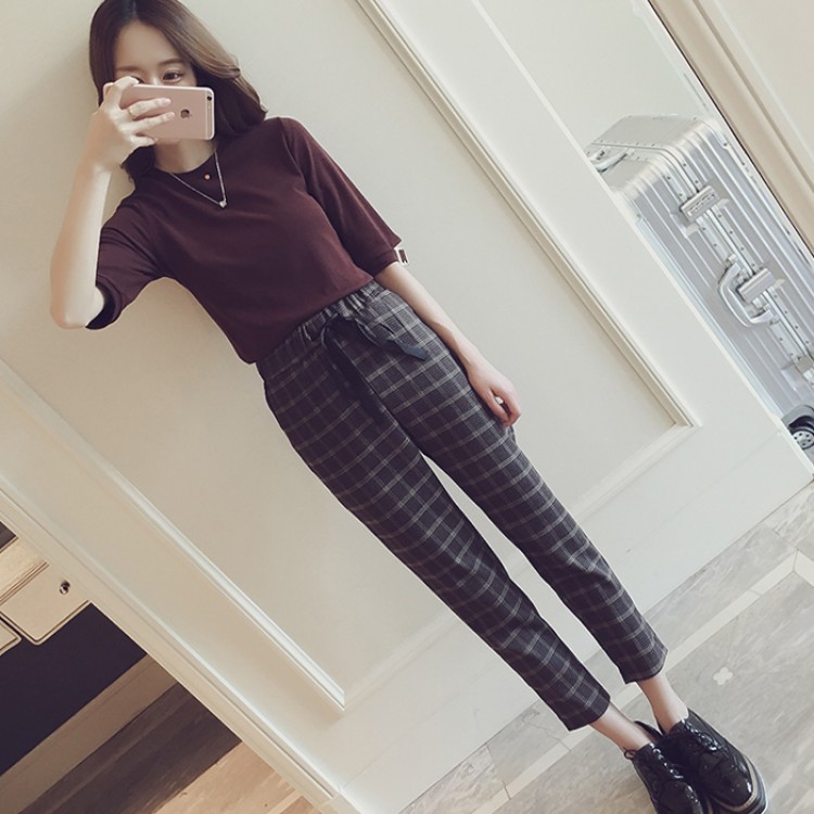 6730 Camicia lavorata a maglia dal temperamento coreano con pantaloni casual a reticolo