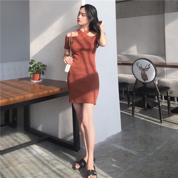 0148 Abito in maglia sottile con spalle scoperte e collo appeso a croce a vento retrò coreano
