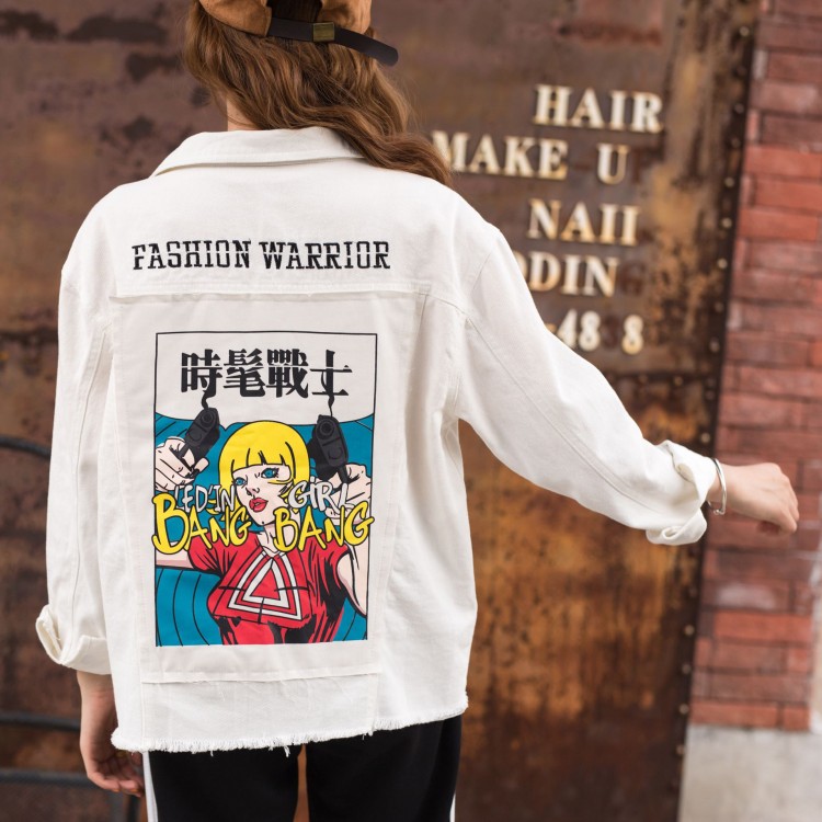 8650 Giacca in denim con stampa cartoon Harajuku sul retro