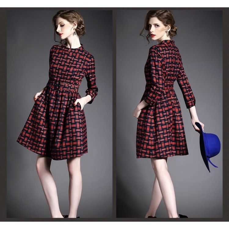 TE3917MY Abito stile principessa a quadri a maniche lunghe in stile europeo