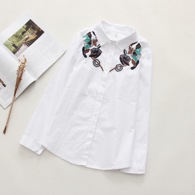 6899 camicia ampia in cotone ricamato fiori di loto a maniche lunghe