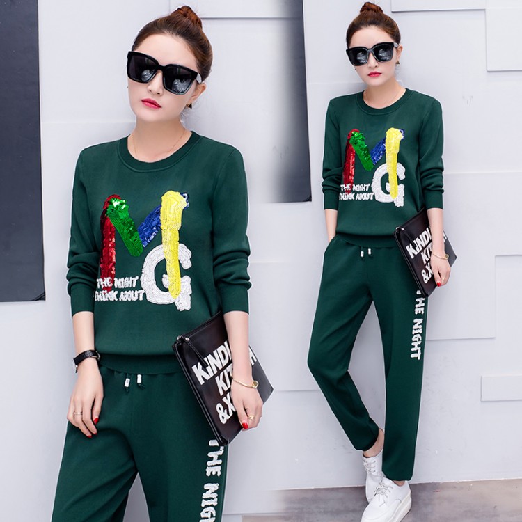 Tuta sportiva 708 con paillettes, tuta sportiva casual in due pezzi con scollo tondo