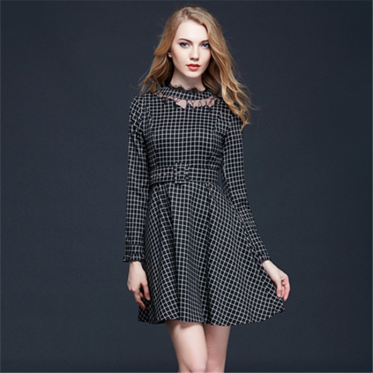TE5856NS OL Abito autunnale con ornamento in pizzo a quadri inglesi a vita sottile