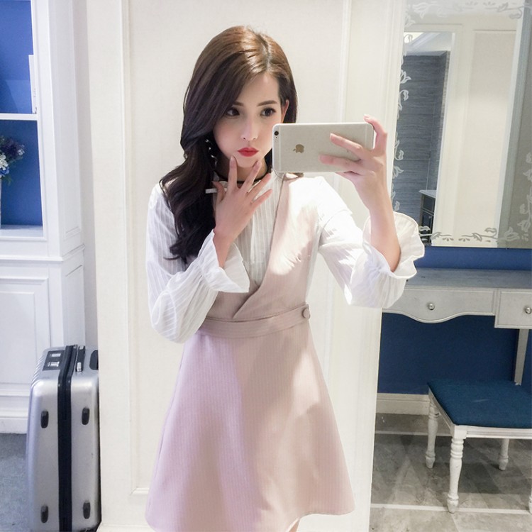 Abito con colletto a V e cinturino a righe 6807 con camicia a maniche lunghe temperamento