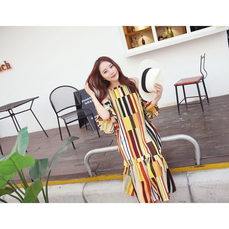 TE6436YZS Maxi abito da spiaggia con spalle scoperte e strisce colorate con geometrie in stile vacanza