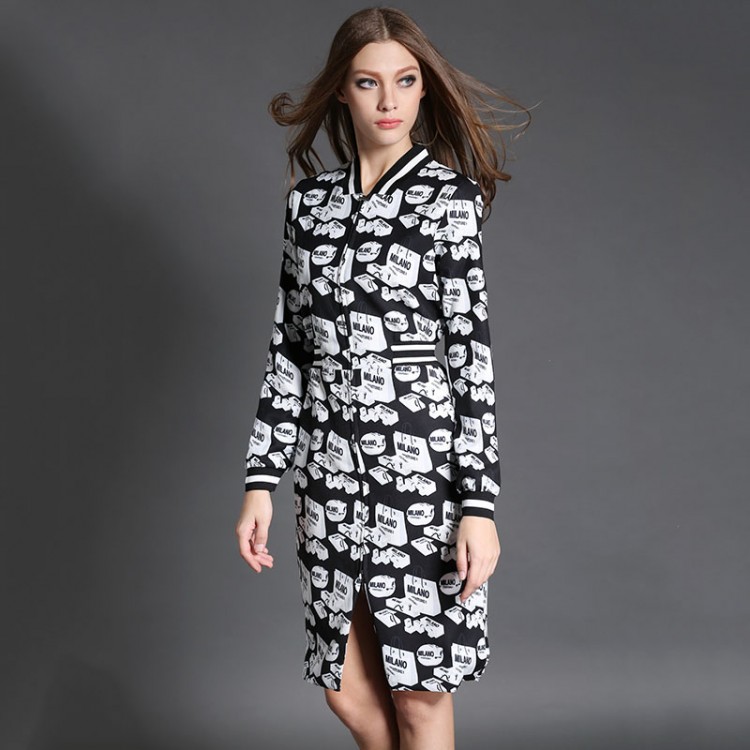 TE6019HYXMW Abito a maniche lunghe con scollo a V con cerniera e stampa temperamento autunnale