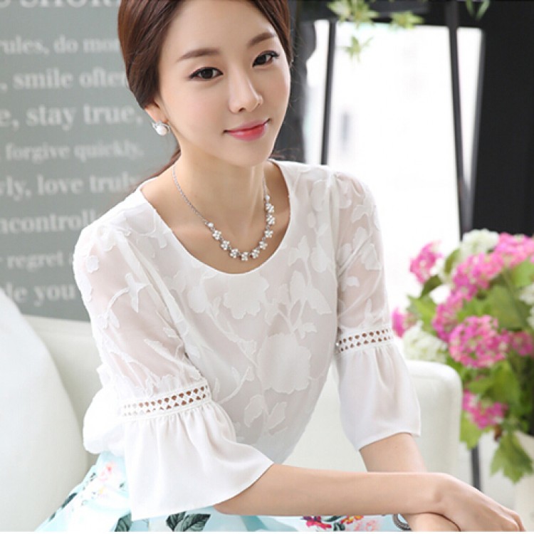 TE1525WSSP Top con maniche a sbuffo in chiffon jacquard di pizzo nuovo stile