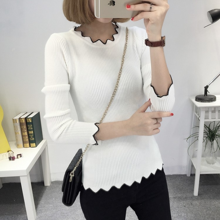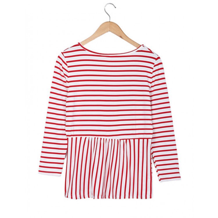 T-shirt a maniche lunghe con collo rotondo e orlo a foglia di loto a righe 2071