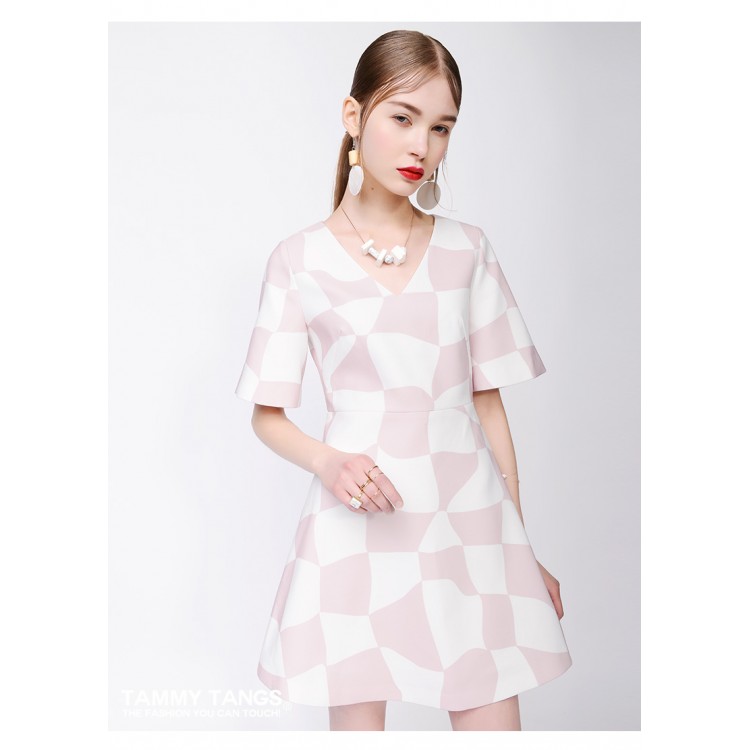 TE9649LLYG Abito slim con scollo a V da donna a quadri rosa moda Europa