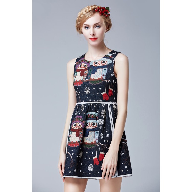 TE9631LLYG Abito senza maniche in tessuto jacquard con stampa gufo girocollo alla moda europea