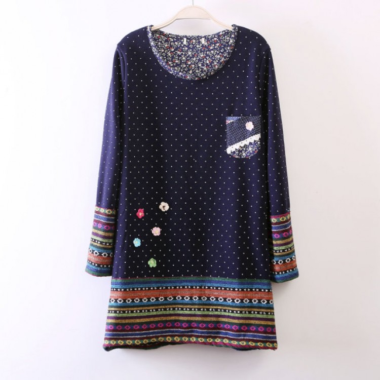 TE255LLNR T-shirt lunga con impunture ricamate a pois in stile nazionale