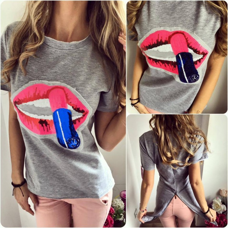 TE3096YZS T-shirt in cotone con stampa pailette labbra rosse e cerniera sul retro