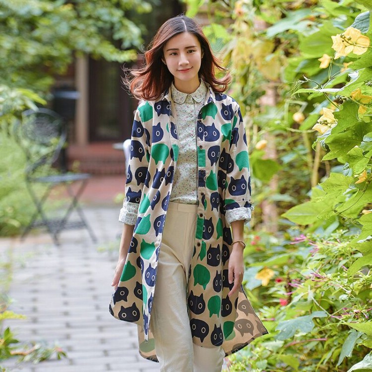 9638 camicia ampia in cotone e lino a maniche lunghe con motivo gatto