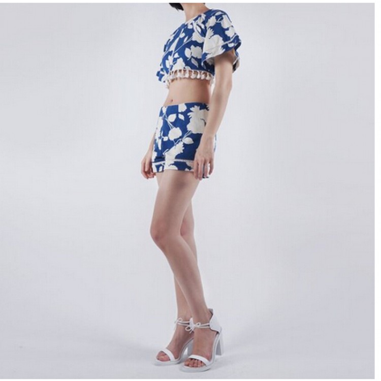 TE3879NX Top corto con nappe con stampa digitale di foglie di loto e pantaloncini