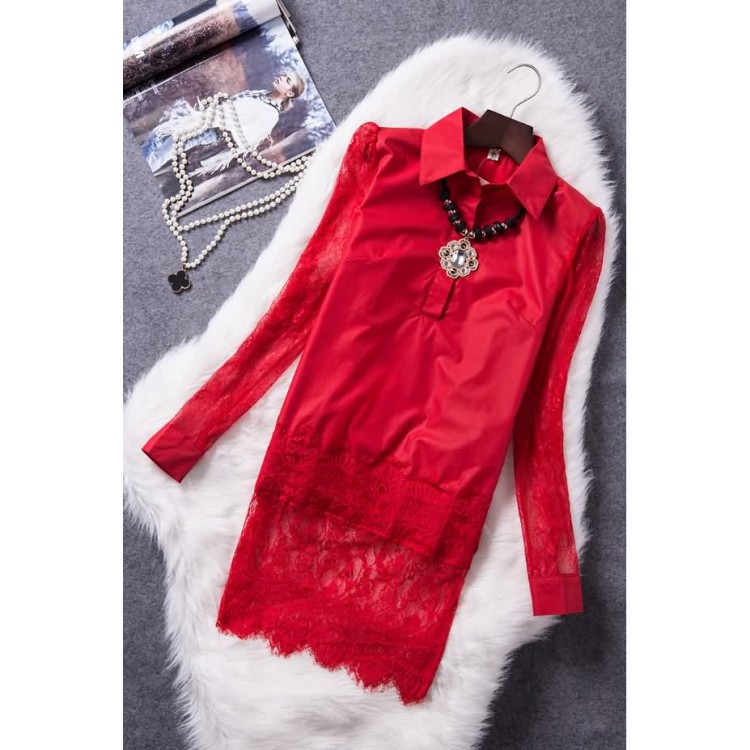 TE6917MEY Camicia con risvolto in colore puro con giunture in pizzo alla moda coreana