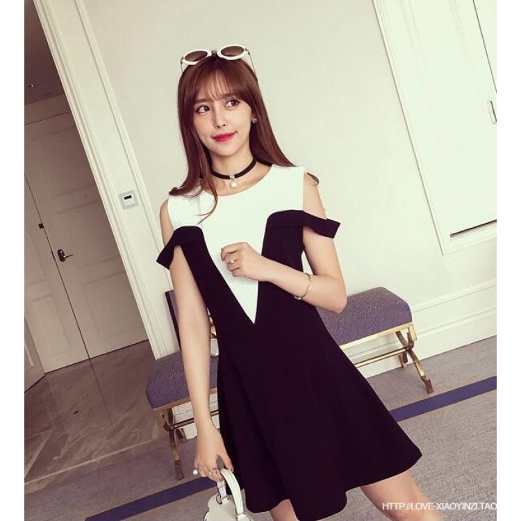 TE6606HXFS Abito da donna con temperamento, colore a contatto, scollo a V, spalle scoperte