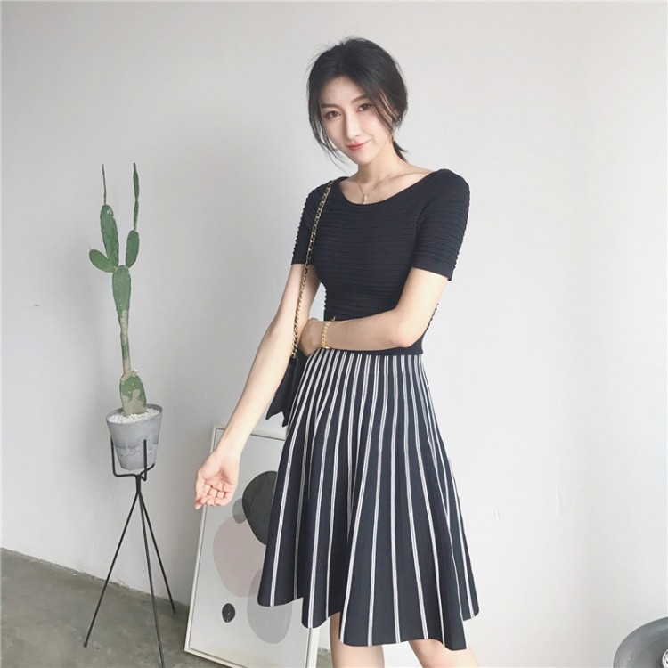 0150 Abito in maglia pieghettata a righe verticali a maniche corte con collo rotondo stile retrò coreano