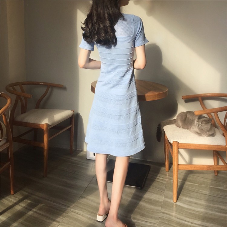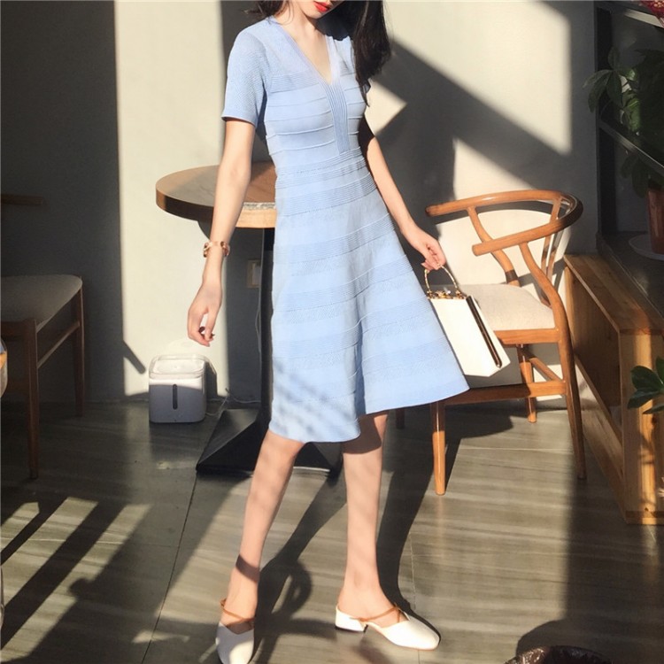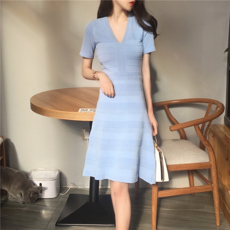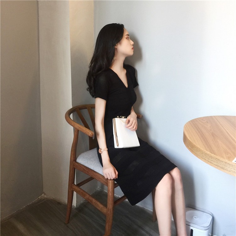 0155 Abito coreano in maglia a forma di S cava con scollo a V retrò