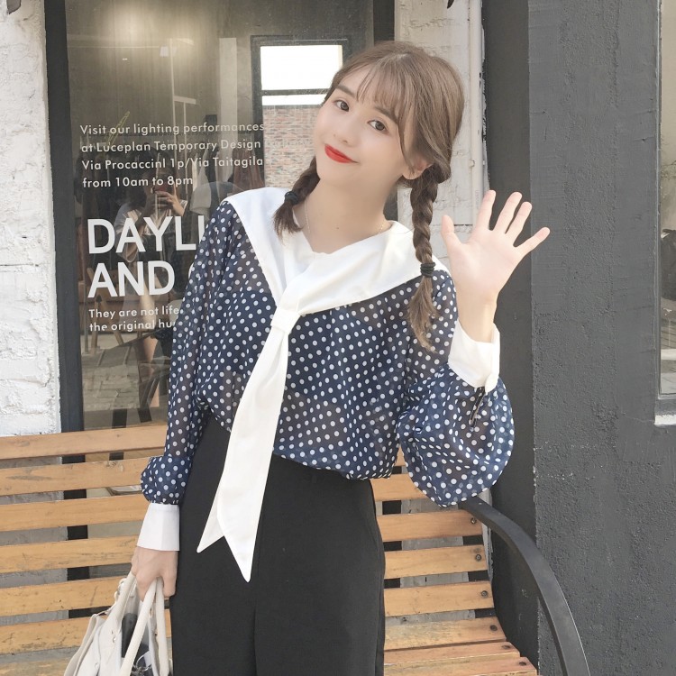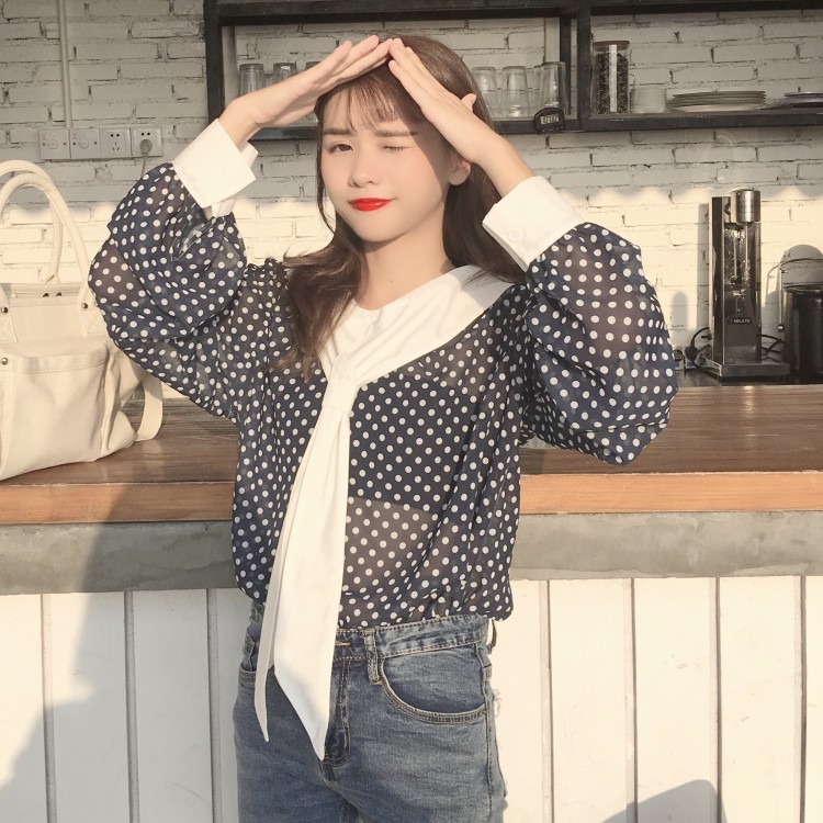 562 La ragazza autunnale coreana sente la camicia con protezione solare dal collo blu scuro
