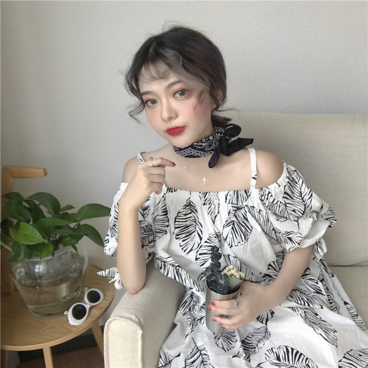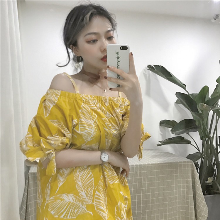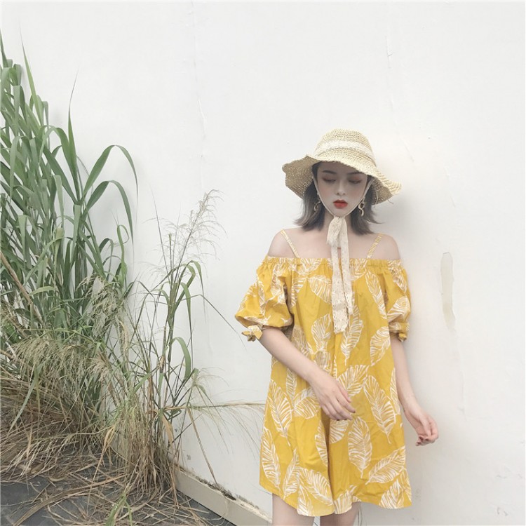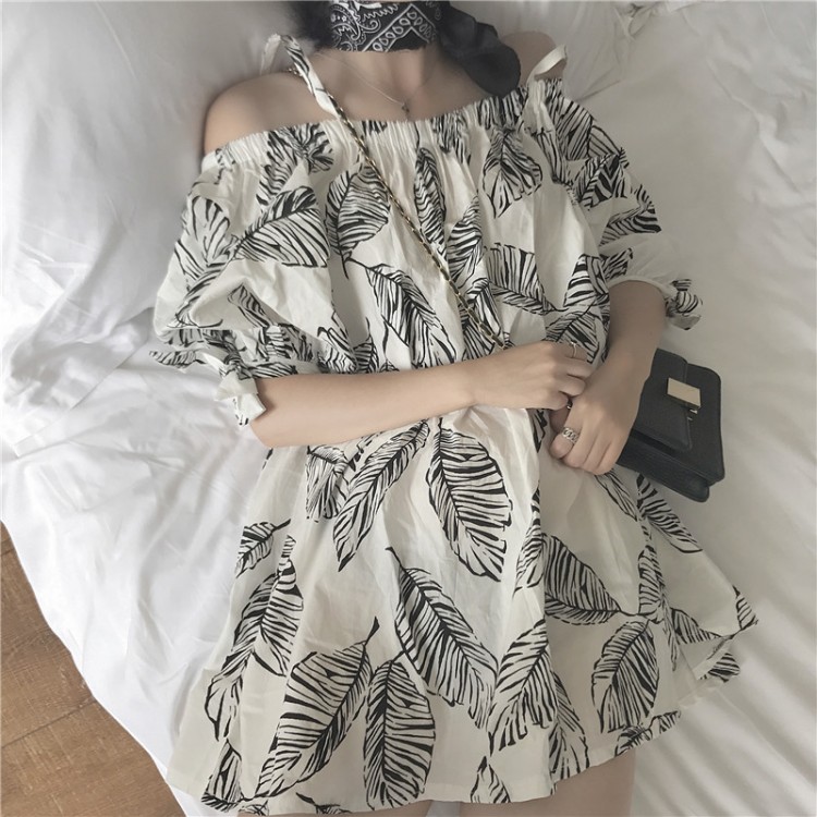 6603 chic foglie semplici stampate temperamento dolce vestito con tracolla