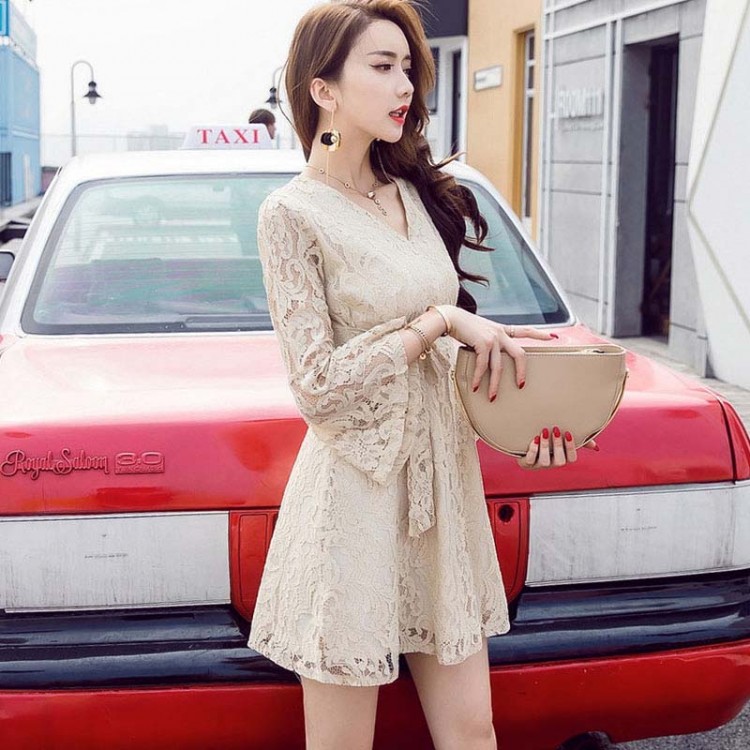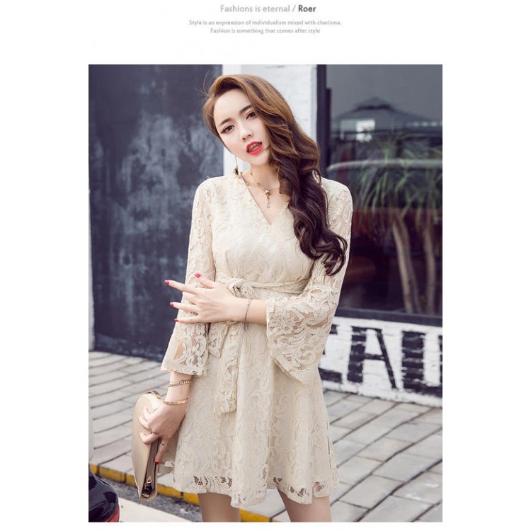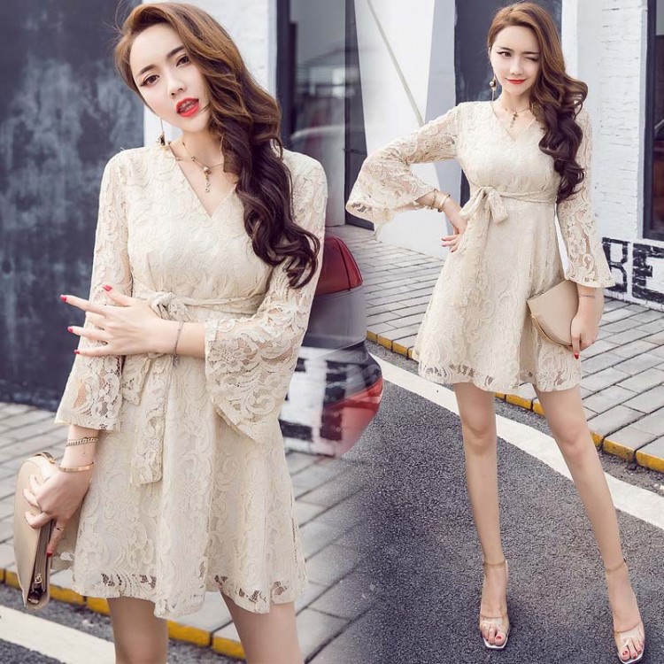 7146 Abito in vita con cravatta e manica a tromba con scollo a V dal temperamento coreano