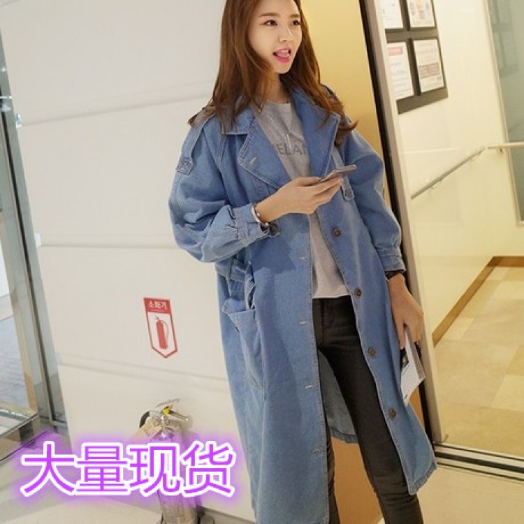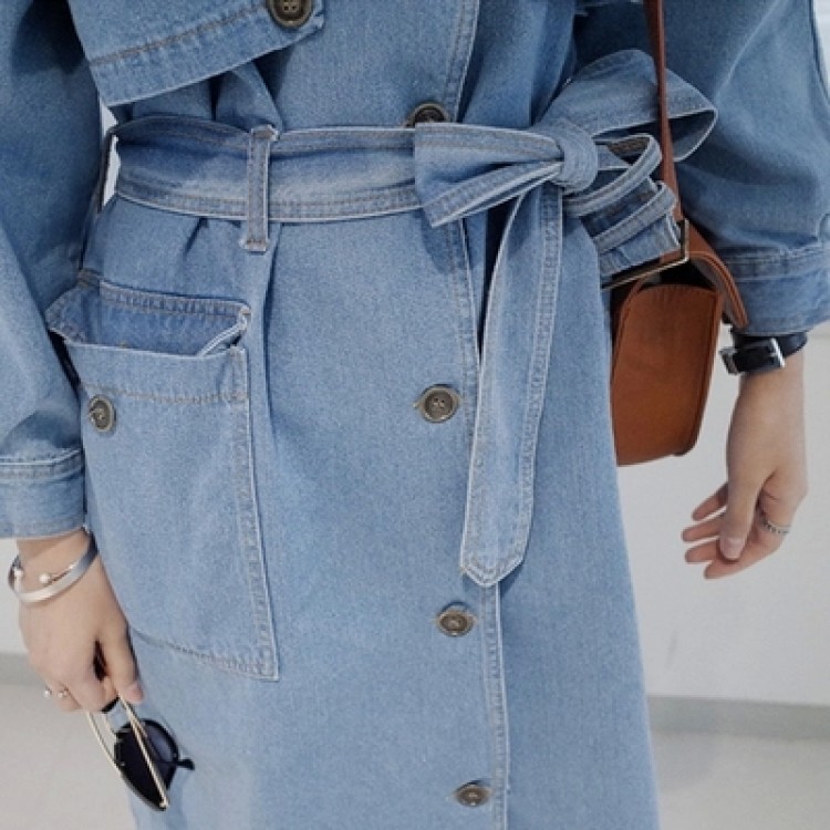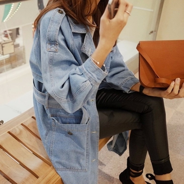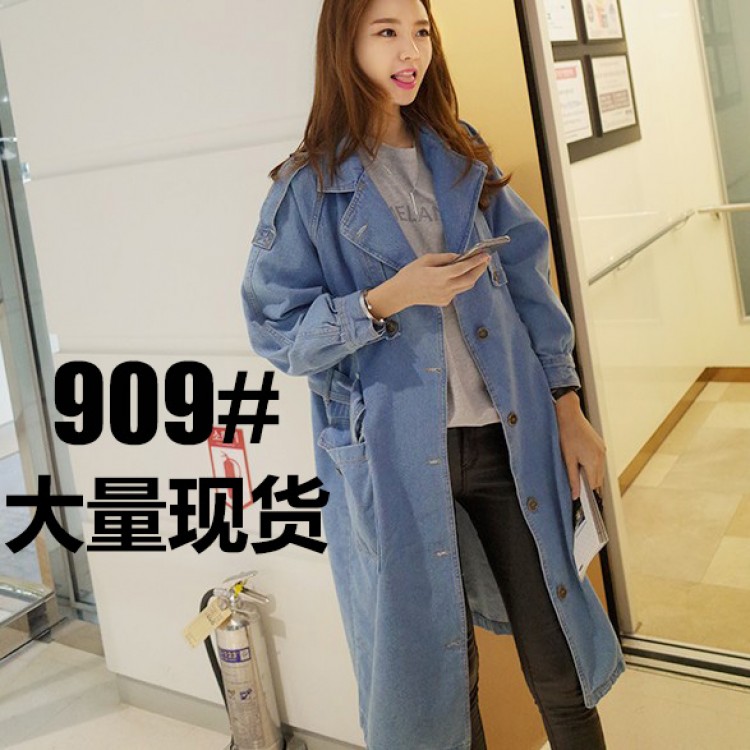 909 Giacca a vento coreana alla moda, giacca di jeans lunga al ginocchio, ampia e larga, con cravatta in vita