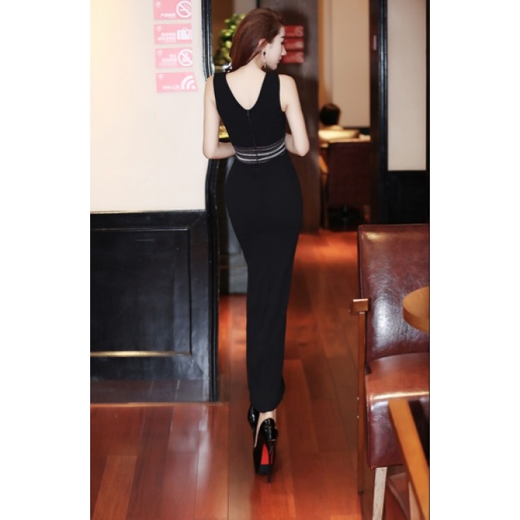 TE5861YFFS Vestito maxi senza maniche con scollo a V e motivo a onde, vita sottile, spacco