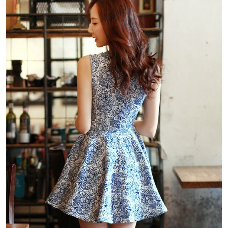 TE5905DDJP Abito da spiaggia senza maniche con motivo porcellana bianco e blu