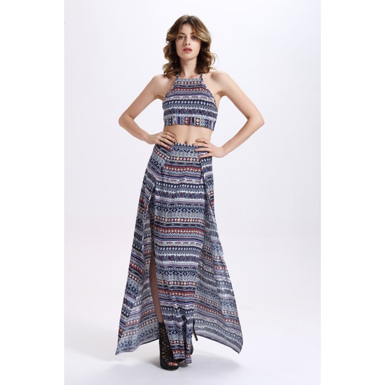 TE2112OMSS Top corto alla moda europeo con allacciatura sulla schiena e gonna divisa