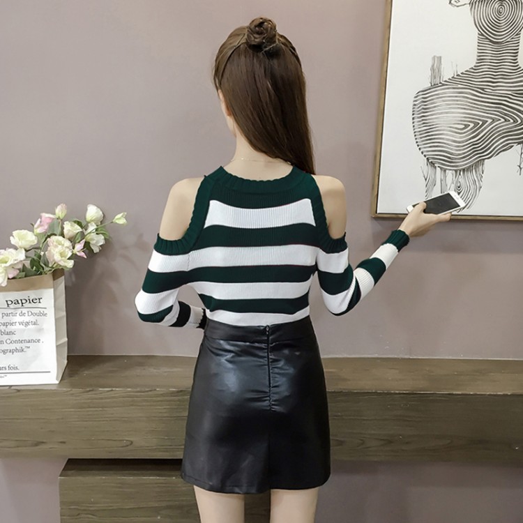 159 camicia da donna in maglia a maniche lunghe con spalle scoperte e strisce a maniche lunghe