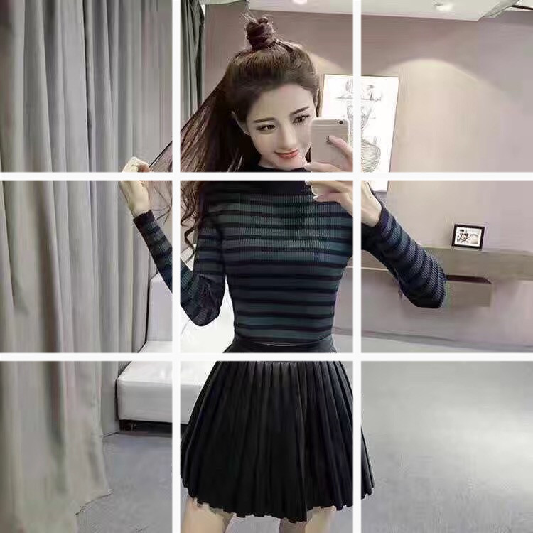 660 Camicia con fondo lavorato a maglia a righe in maglione con collo semi-alto alla moda coreana