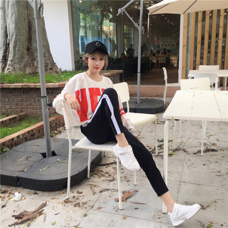 Pantaloni casual in tinta unita per il tempo libero con barra bianca a vita alta 1300 CHIC