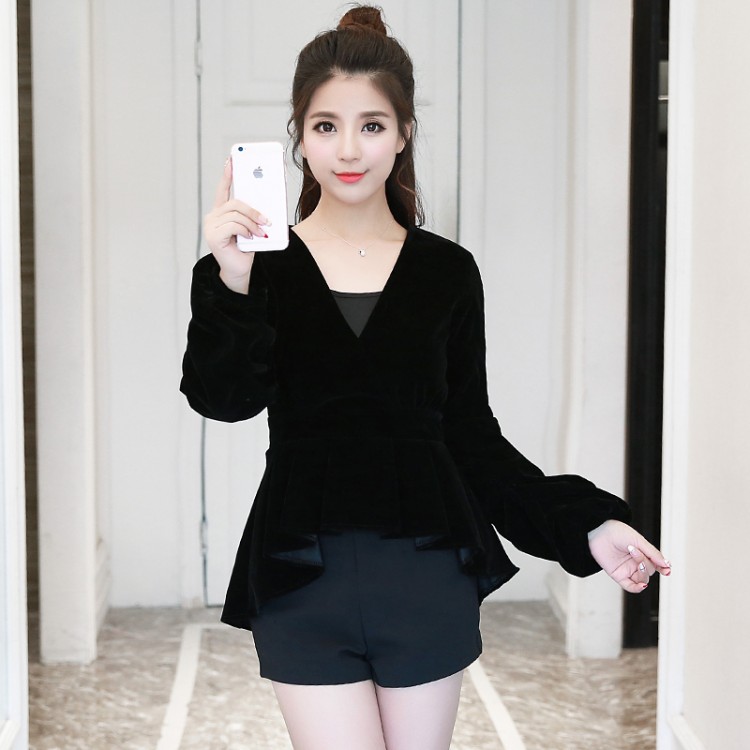 8606 Top con orlo a foglia di loto con scollo a V in velluto vintage cigno
