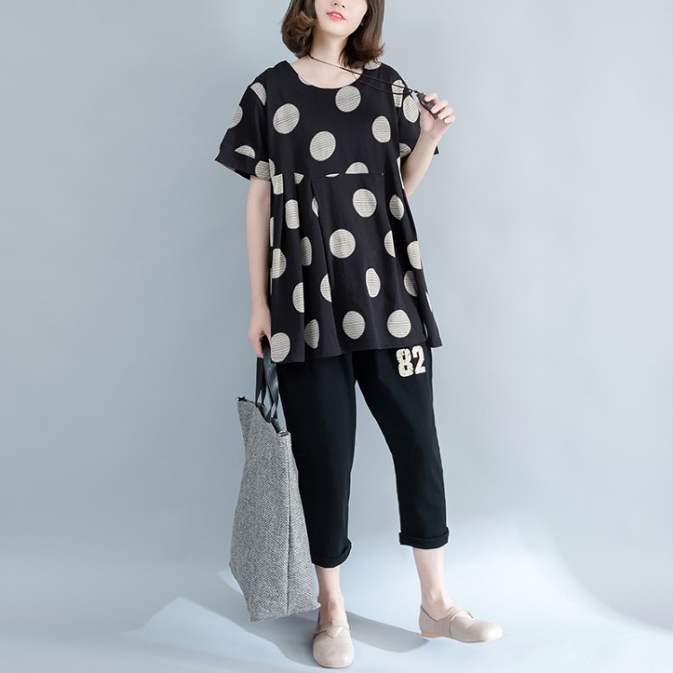 T-shirt in vita con stampa a pois in cotone da donna 8790 di grandi dimensioni