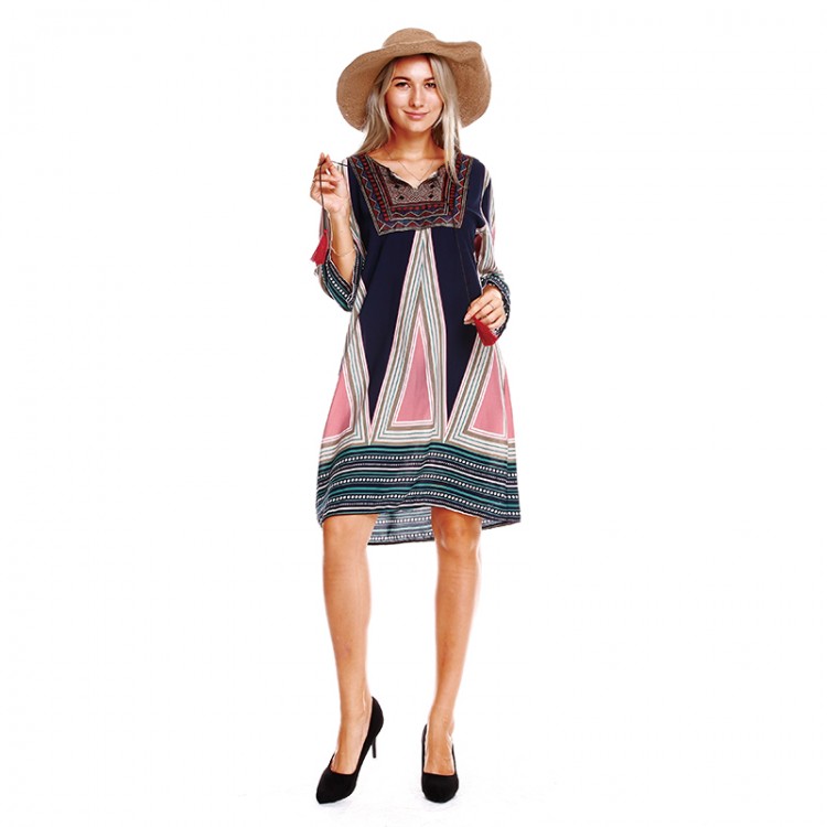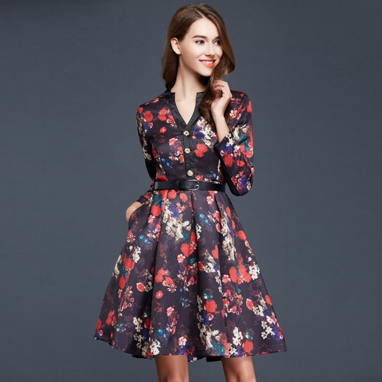 TE9093LLYG Abito con scollo a V e maniche lunghe in trama jacquard con stampa vintage