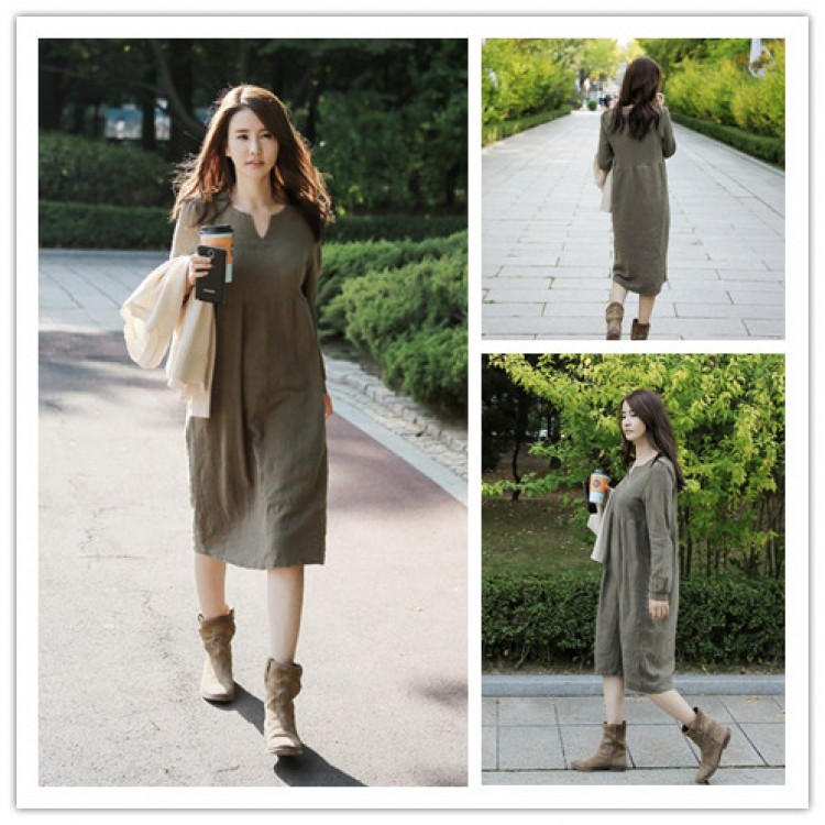 TE1115GJ Abito lungo alla moda coreana in cotone ramiè allentato con scollo a V